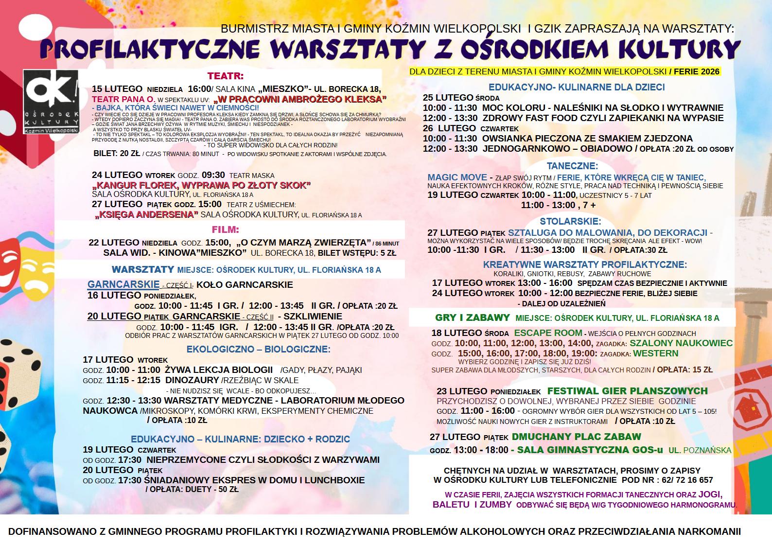 BURMISTRZ MIASTA I GMINY KOŹMIN WIELKOPOLSKI I GZIK ZAPRASZAJĄ NA WARSZTATY: PROFILAKTYCZNE WARSZTATY Z OSRODKIEM KULTURY